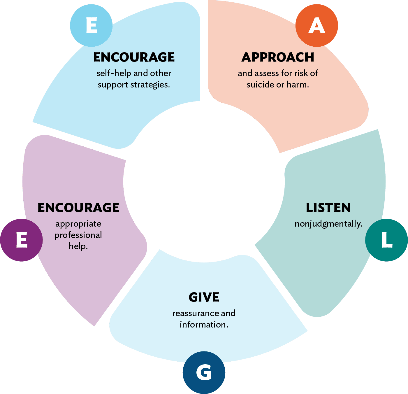 There is no one-size-fits-all approach to using the MHFA Action Plan (ALGEE) — you don’t even have to use every single step to provide support. Every situation will be different, and you can use these 5 steps in any order.