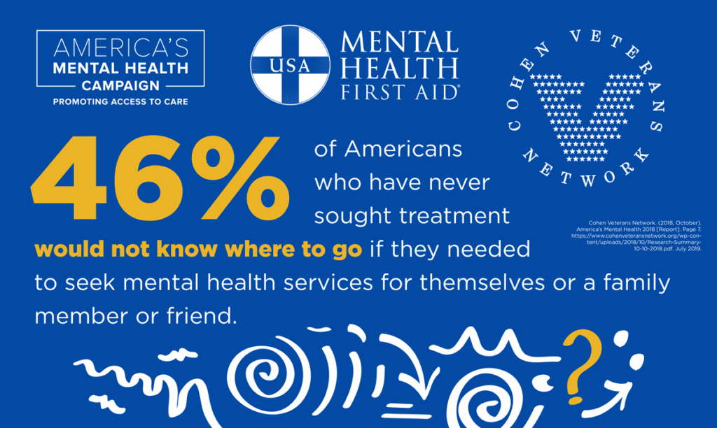 When you’re struggling with a mental health or substance use problem, it can be hard to get the help you need. With a surplus of information available online, it may be confusing to know what kind of help you might need, where to go or who to talk to. According to Cohen Veterans Network’s 2018 America’s Mental Health study, 46 percent of people who have never sought mental health treatment would not know where to go if they needed to seek services for themselves or a loved one.